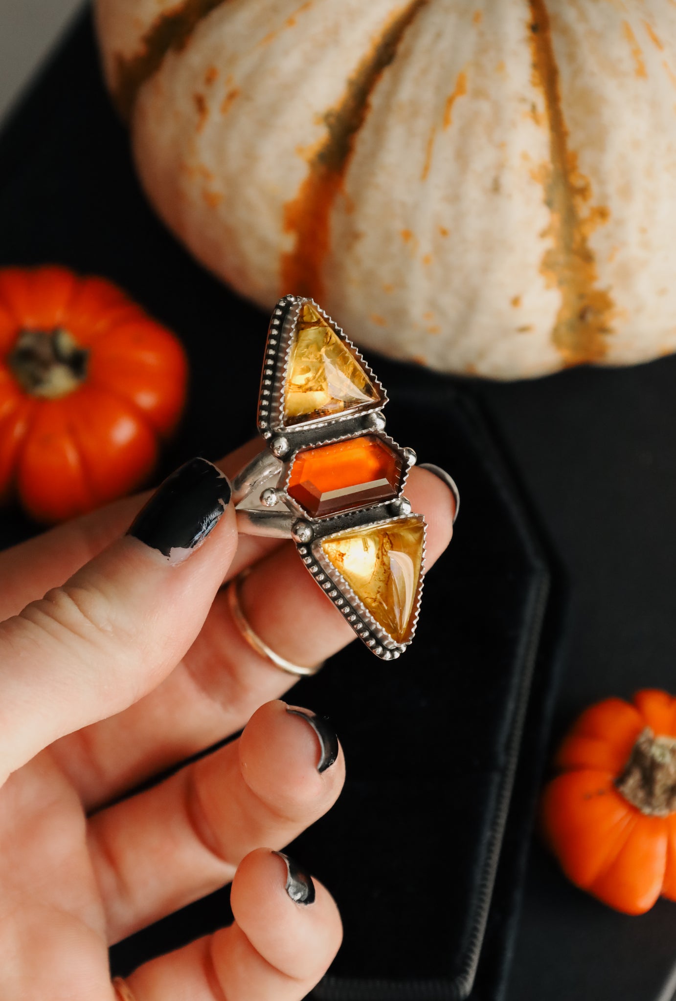 Amber with hessonite garnet. Finished in your size on a double wire ring shank. Handmade with sterling silver.
