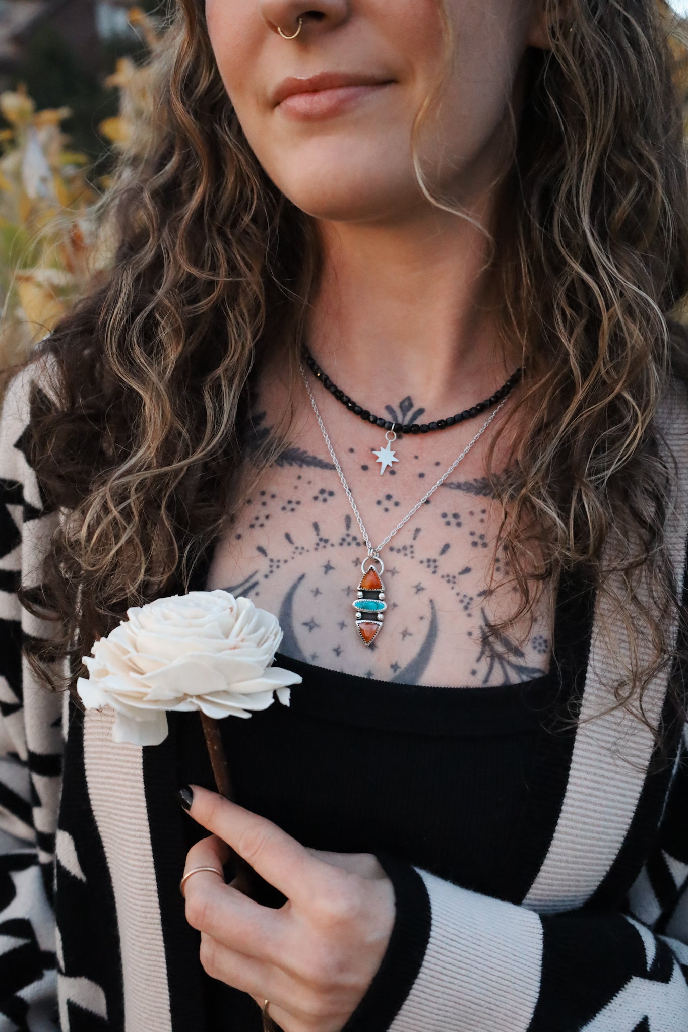 Hessonite garnet + turquoise pendant. Comes on an 18" chain. Handmade with sterling silver.