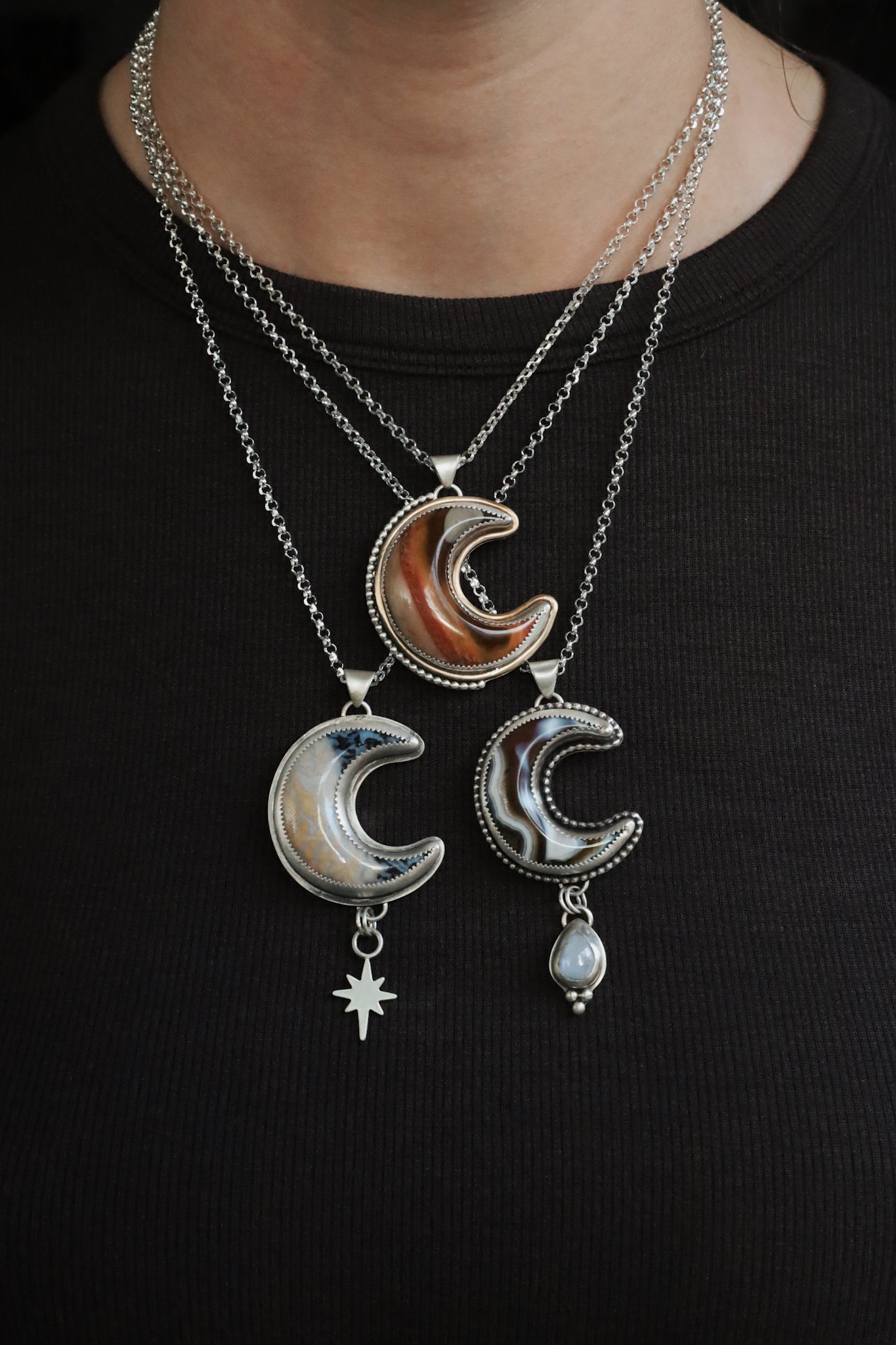 Petrified palm wood with a starburst charm. Comes on an 18" chain. Handmade with sterling silver.